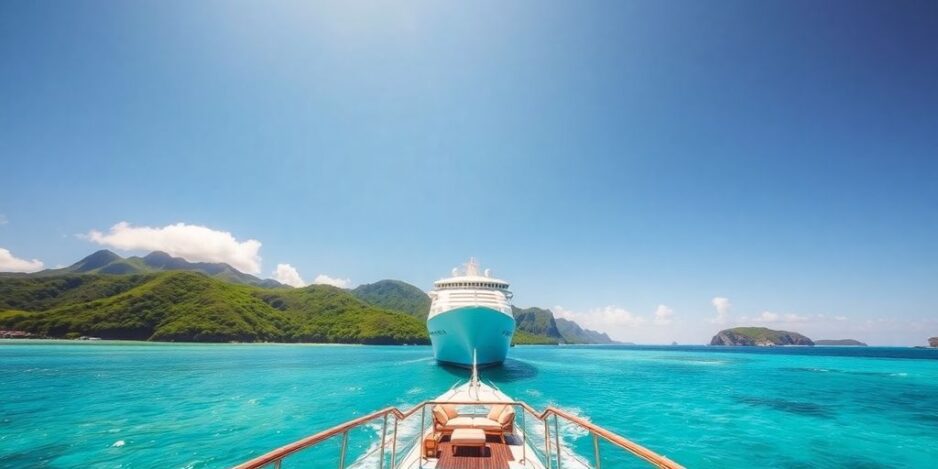 Kreuzfahrtschiff auf türkisfarbenem Wasser mit tropischen Inseln.